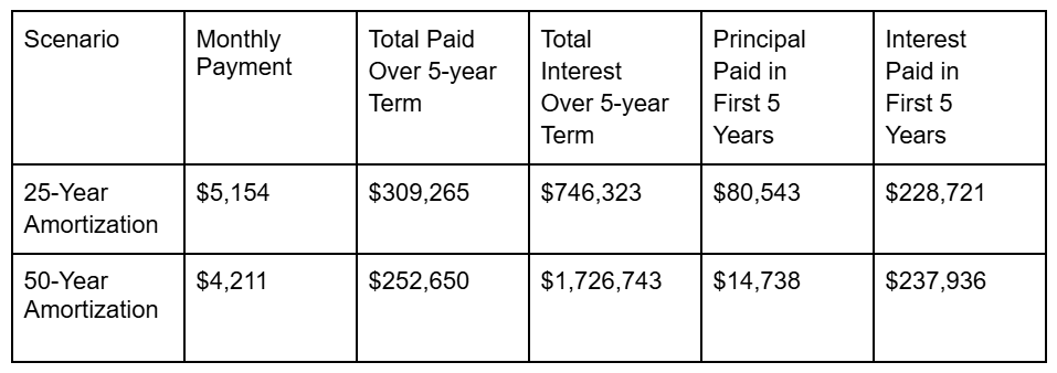 The 50-year amortization trims the monthly payment by about $943 compared to the 25-year option. Over the full term, the 50-year structure costs roughly $980,000 more in total interest.